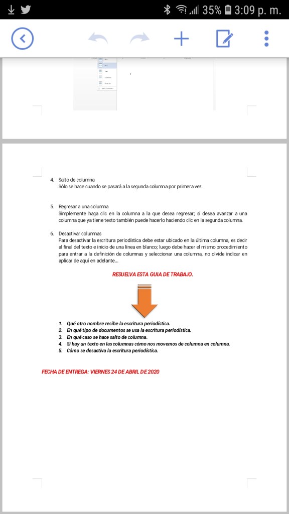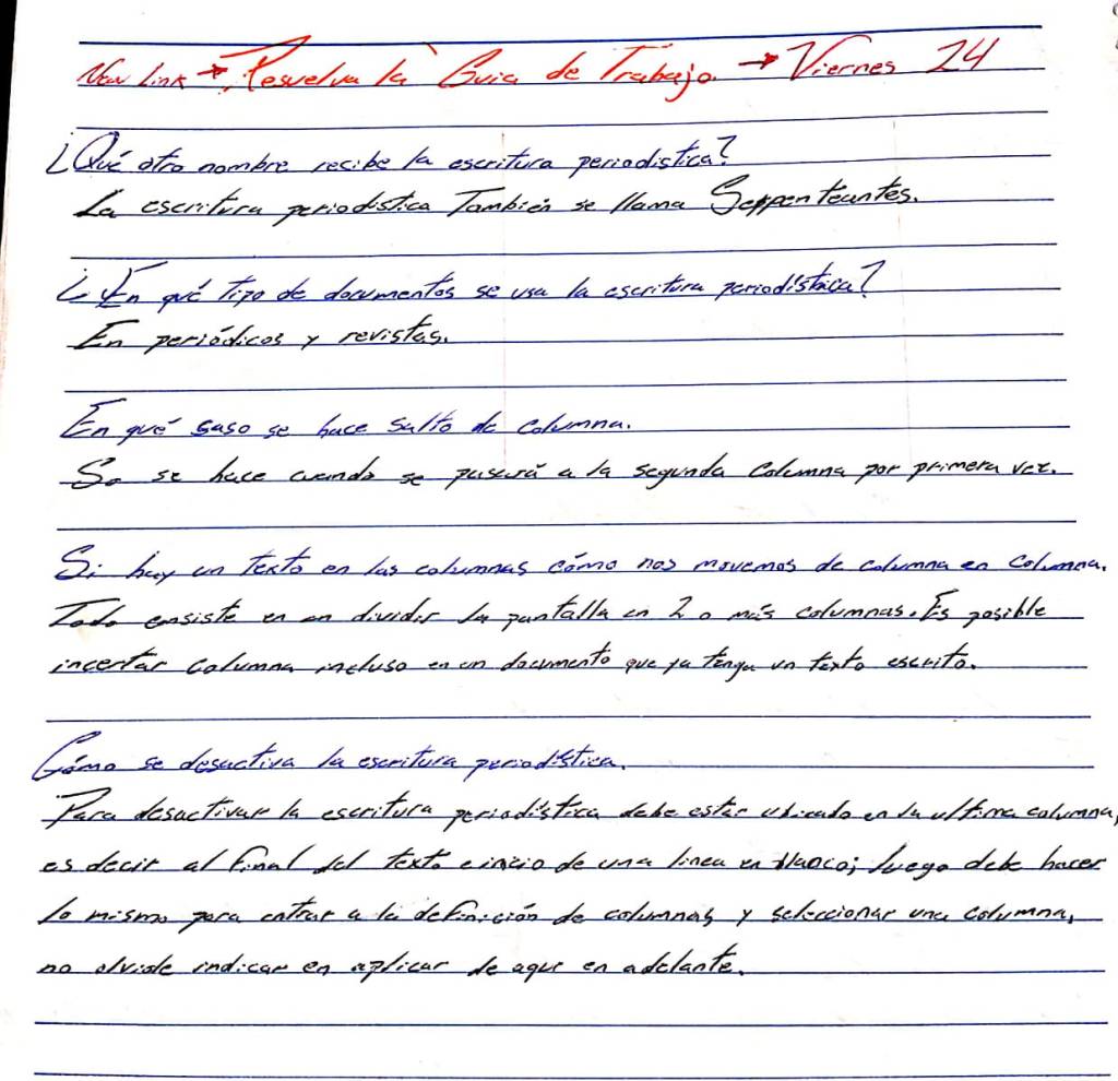 S -11 / 20 – 24 Abril Esta semana los jóvenes resolvieron una guía de trabajo con el tema: Escritura periodística. Compártelo: Haz clic para compartir en X (Se abre en una ventana nueva) X Haz clic para compartir en Facebook (Se abre en una ventana nueva) Facebook Me gusta Cargando...